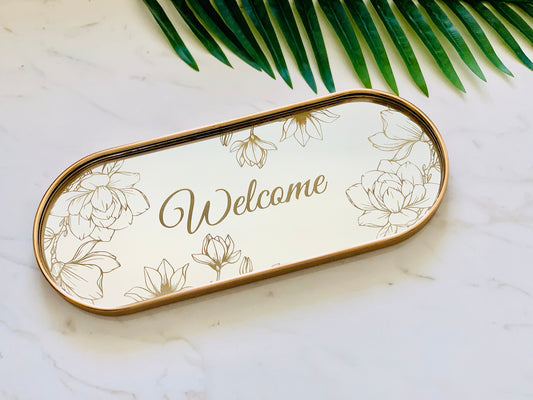 Personalized Jewelry Mirror Tray – Engraved Magnolia & Roses Oval Golden Vanity Organizer