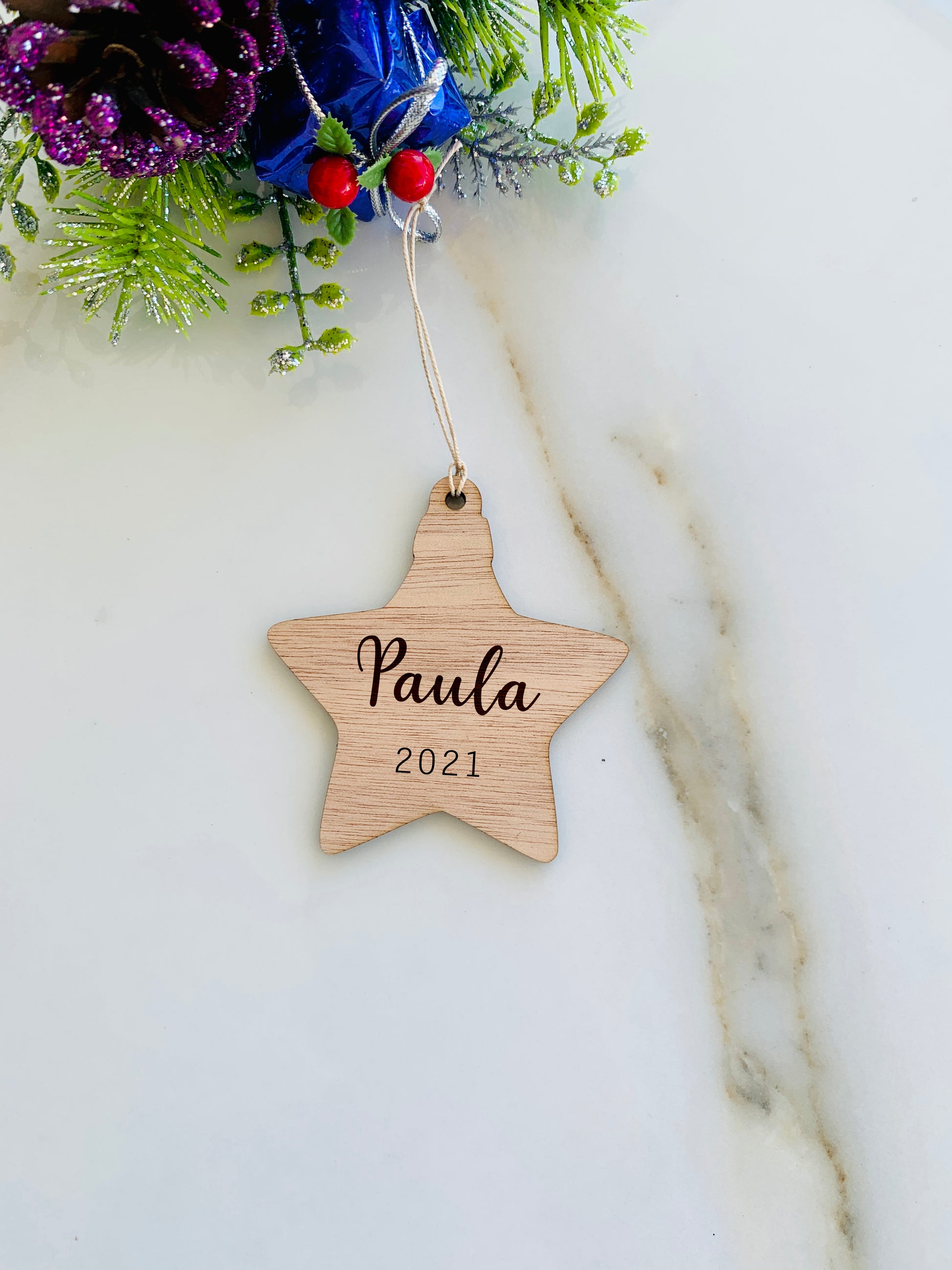 Dieser personalisierte Stern als Weihnachtsschmuck aus Holz ist die ideale Ergänzung für Ihre Weihnachtsdekoration. Gefertigt aus hochwertigem Sperrholz, verleiht er Ihrem Weihnachtsbaum oder Ihrem Zuhause einen natürlichen, rustikalen Charme.