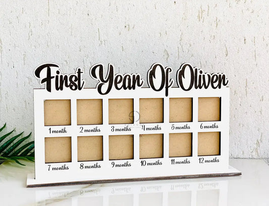 Marco de fotos personalizado para el primer año del bebé: Tablero de hitos de madera