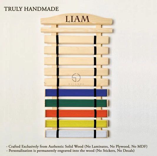 Exhibidor personalizado para cinturones de karate: Organizador de madera maciza para cinturones de artes marciales, taekwondo, jiu-jitsu, judo y bJJ (5-18 cinturones).