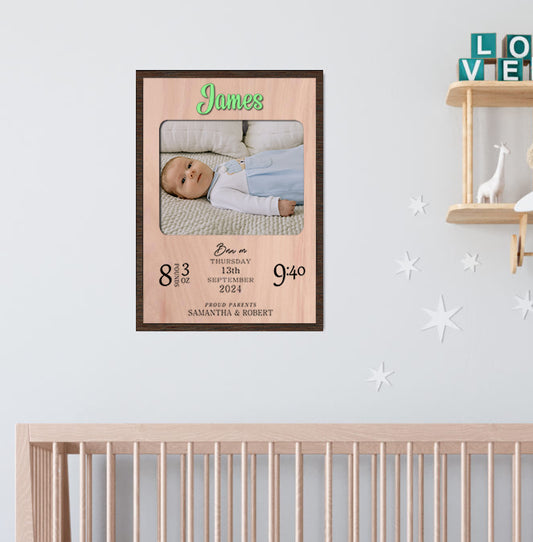 Marco de fotos personalizado con detalles del nacimiento del recién nacido: recuerdo de madera grabada