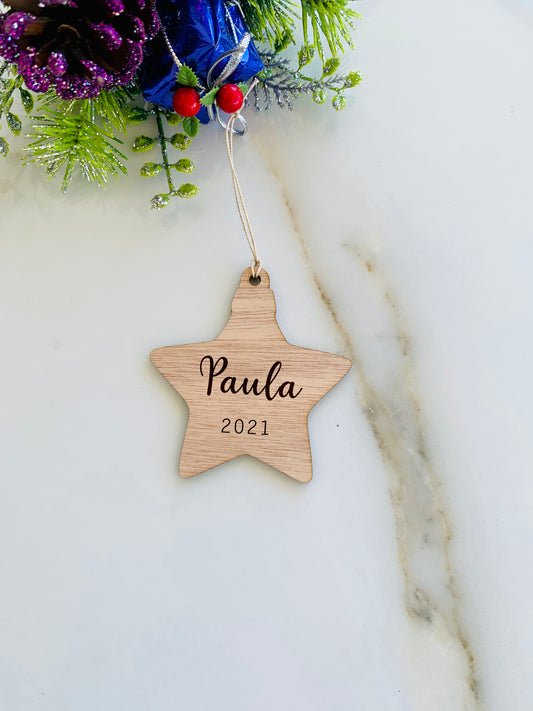 Adorno navideño de madera con forma de estrella, personalizado, con nombre para niños y familia grabado, estrella navideña con nombre de lugar, adorno de madera personalizado, regalo familiar