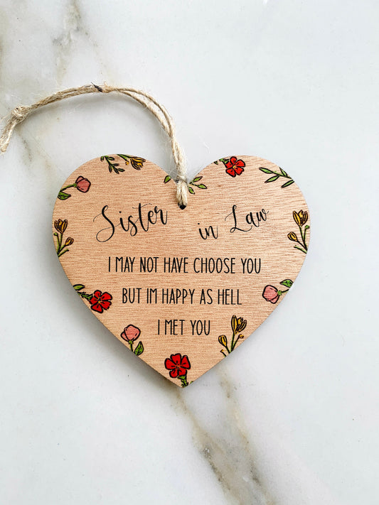 Regalo para la cuñada: Letrero colgante de madera con forma de corazón, hecho a mano con grabado floral: "Puede que no te elija, pero me alegro de haberte conocido". Un recuerdo sentimental.