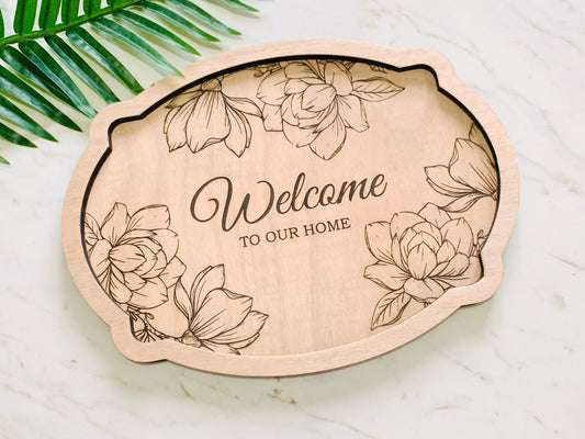 Bandeja de madera Magnolia grabada a medida: Decoración personalizada para el hogar, otomana, bandeja para objetos pequeños o bandeja de servicio.