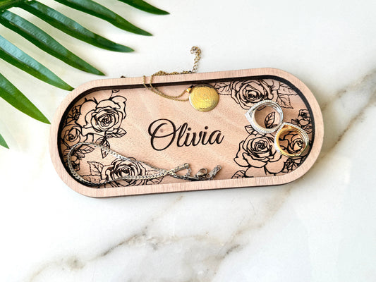 Plato de madera personalizado para anillos: Soporte para joyas con grabado floral