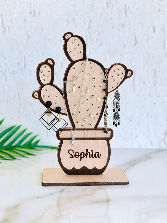 Soporte personalizado para joyas de cactus: Organizador de pendientes y pulseras de madera