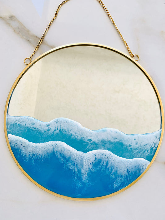Espejo de resina con forma de ola del océano: Arte de pared dorado hecho a mano (9,84 pulgadas)
