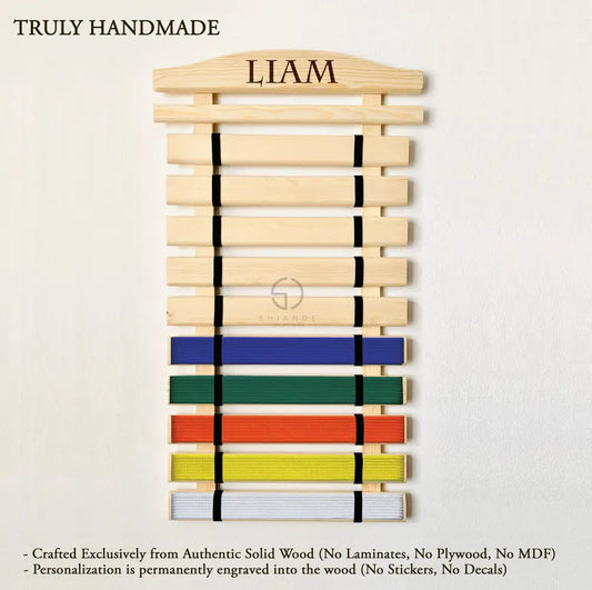 Exhibidor personalizado para cinturones de karate: Organizador de madera maciza para cinturones de artes marciales, taekwondo y jiu-jitsu (5-18 cinturones).