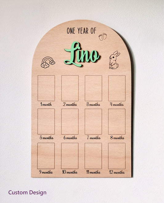 Marco de fotos personalizado para el primer año del bebé: Tablero de hitos de madera