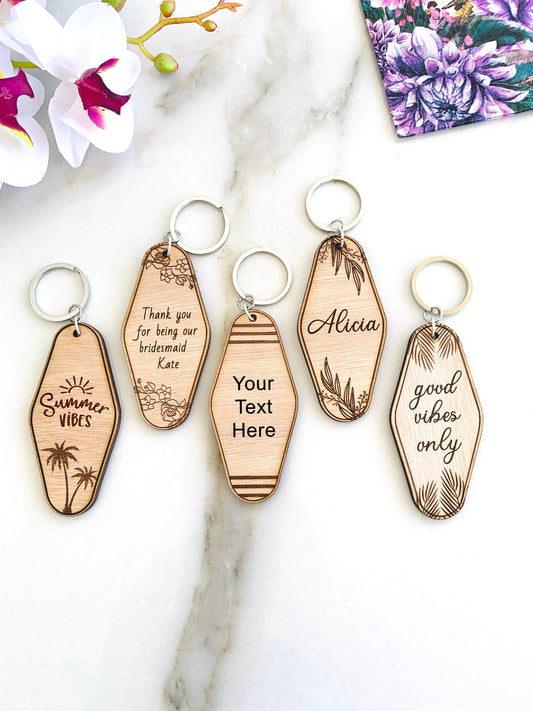Llavero retro de motel, llavero personalizado para damas de honor, llavero de madera grabado, recuerdo de boda, llavero con logo de motel personalizado, regalos para la novia y sus amigos.