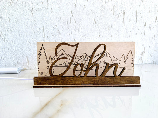 Lámpara de noche de madera personalizada: Paisaje de montaña grabado, lámpara de mesa de noche LED con nombre personalizado