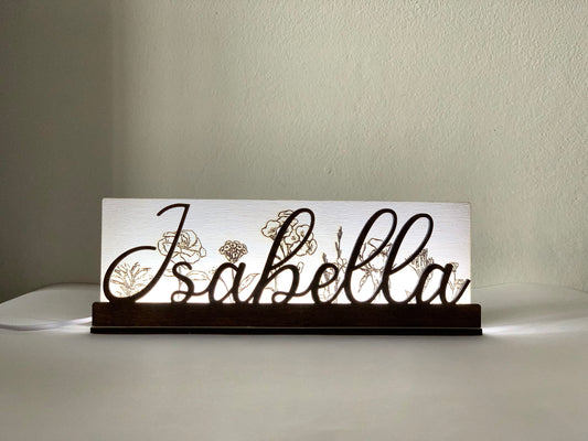 Lámpara de mesa de noche LED con nombre personalizado: Lámpara de madera con grabado floral y diseño floral