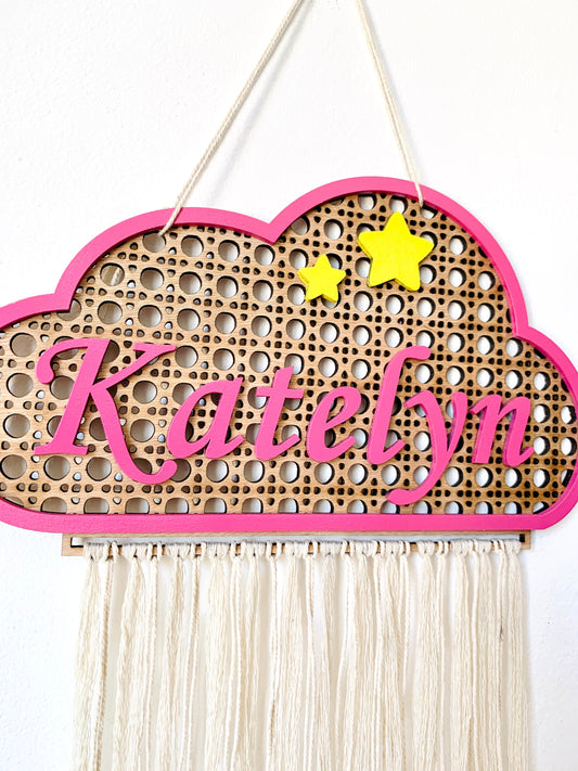 Letrero personalizado con el nombre del bebé en forma de nube - Placa de madera de ratán para habitación infantil, macramé de mimbre, decoración para habitación de recién nacido, letrero para colgar en la pared o la puerta