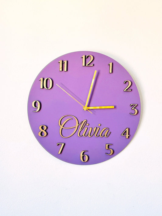 Reloj infantil personalizado: Decoración de madera rosa y morada para la habitación del bebé