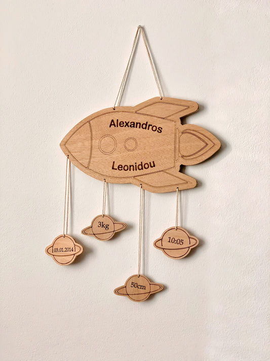 Letrero de madera personalizado con forma de nave espacial para la habitación del bebé: Placa con datos de nacimiento del bebé