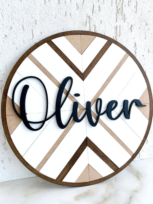 Letrero redondo de madera con nombre y mosaico azteca - Decoración personalizada para habitación infantil, Letrero familiar estilo patchwork de granero