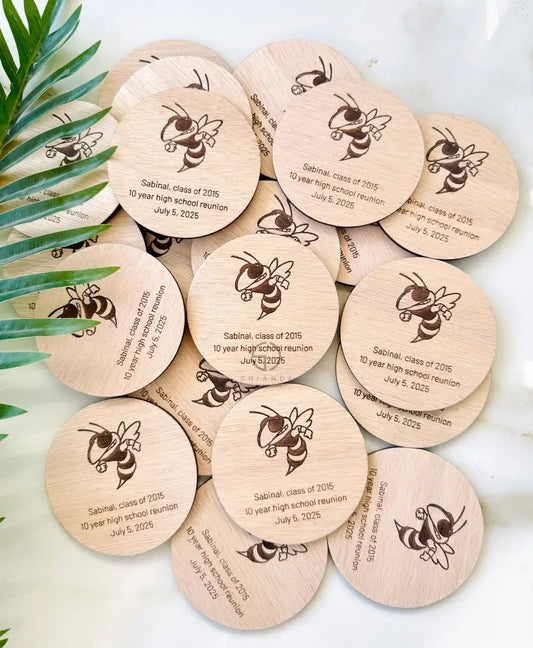Recuerdos personalizados para reuniones de exalumnos: Letreros de madera, posavasos, llaveros