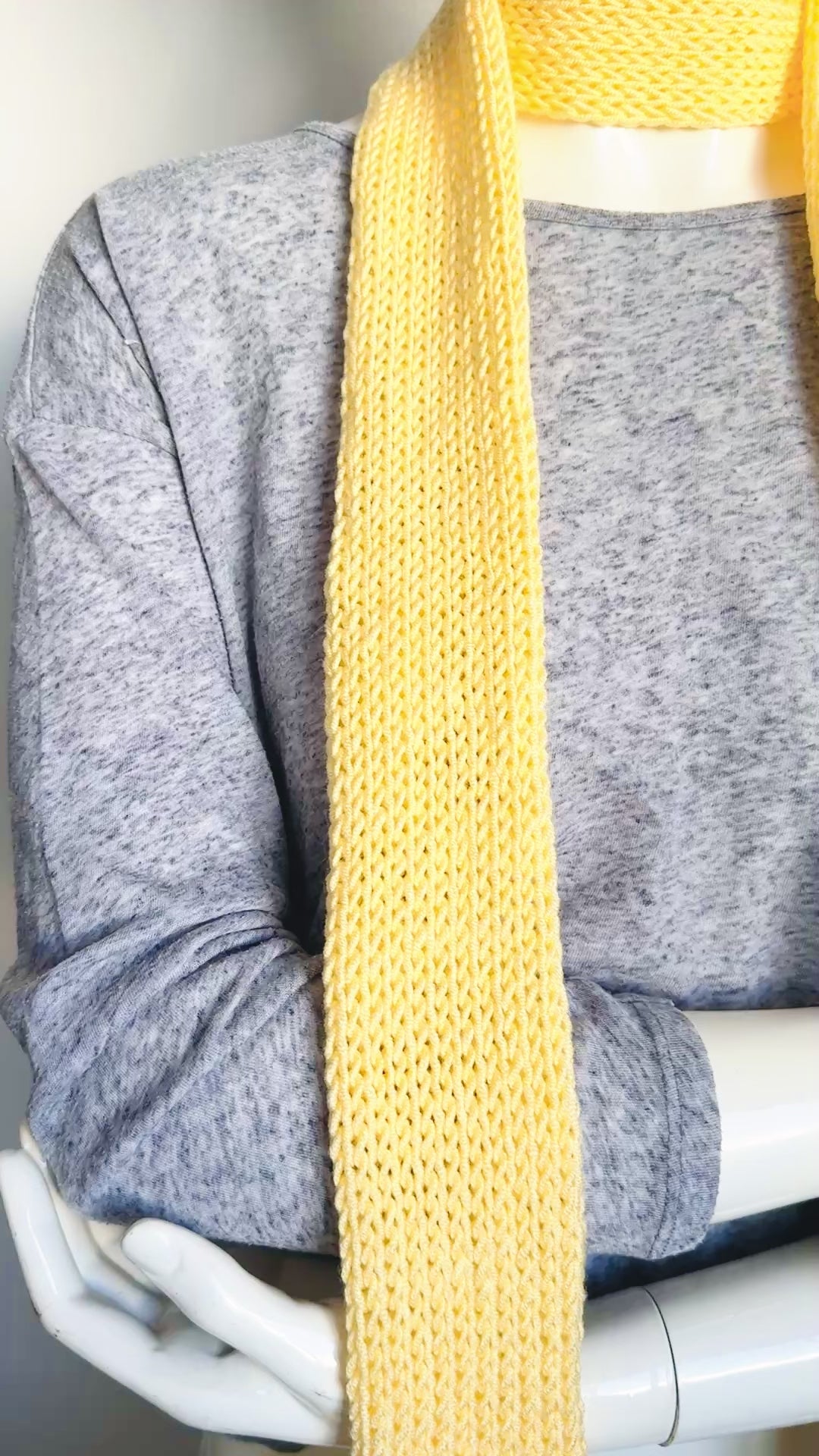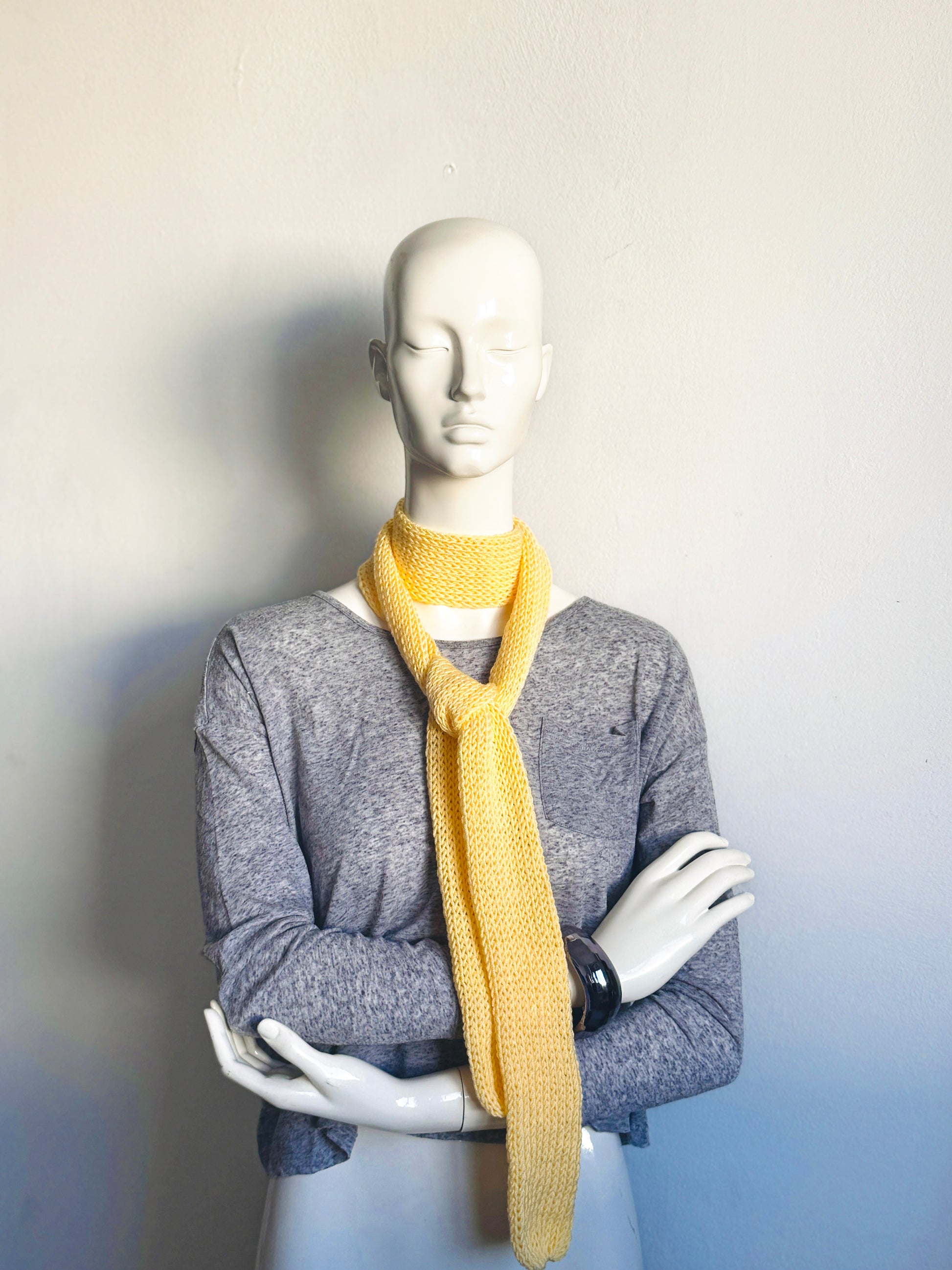 Añade un toque de elegancia a tu vestuario con esta preciosa bufanda fina de punto color amarillo mantequilla. Tejida a mano con esmero, esta versátil bufanda combina a la perfección estilo y comodidad, con un diseño tubular único de doble cara que aporta calidez y estilo.