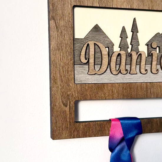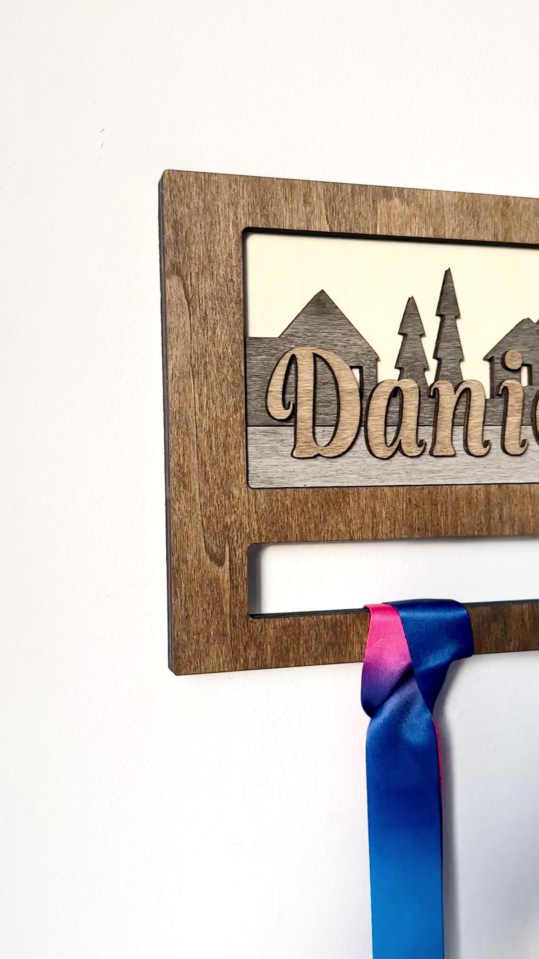 Elaborado con madera cortada con láser de precisión y grabado especialmente para ti, este soporte sujeta varias medallas de forma segura para que puedas crear tu propia galería de marcas de llegada. Perfecto para gimnasios en casa, paredes de oficinas y rincones de trofeos que merecen lucirse.