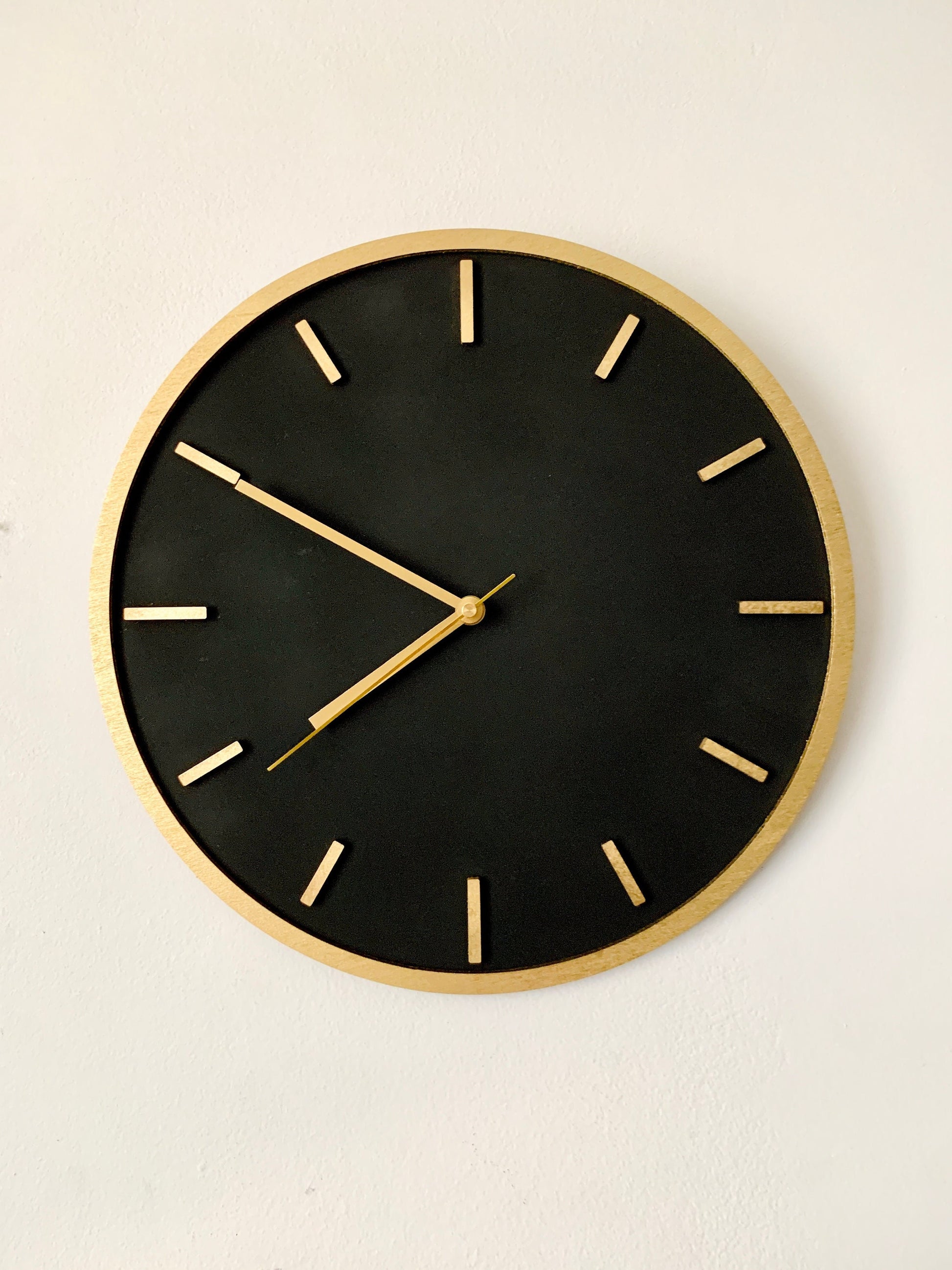 Featuring a sleek black face contrasted with detailed gold accents, it brings a sophisticated touch to any room.