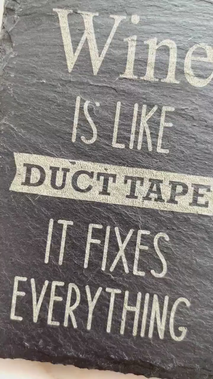 Discover our expertly crafted personalized slate coasters, each engraved with witty sayings like "Duct Tape Fixes Everything." Perfect for adding a distinctive and humorous flair to your living space, these durable stone coasters shield your furniture from watermarks and stains.