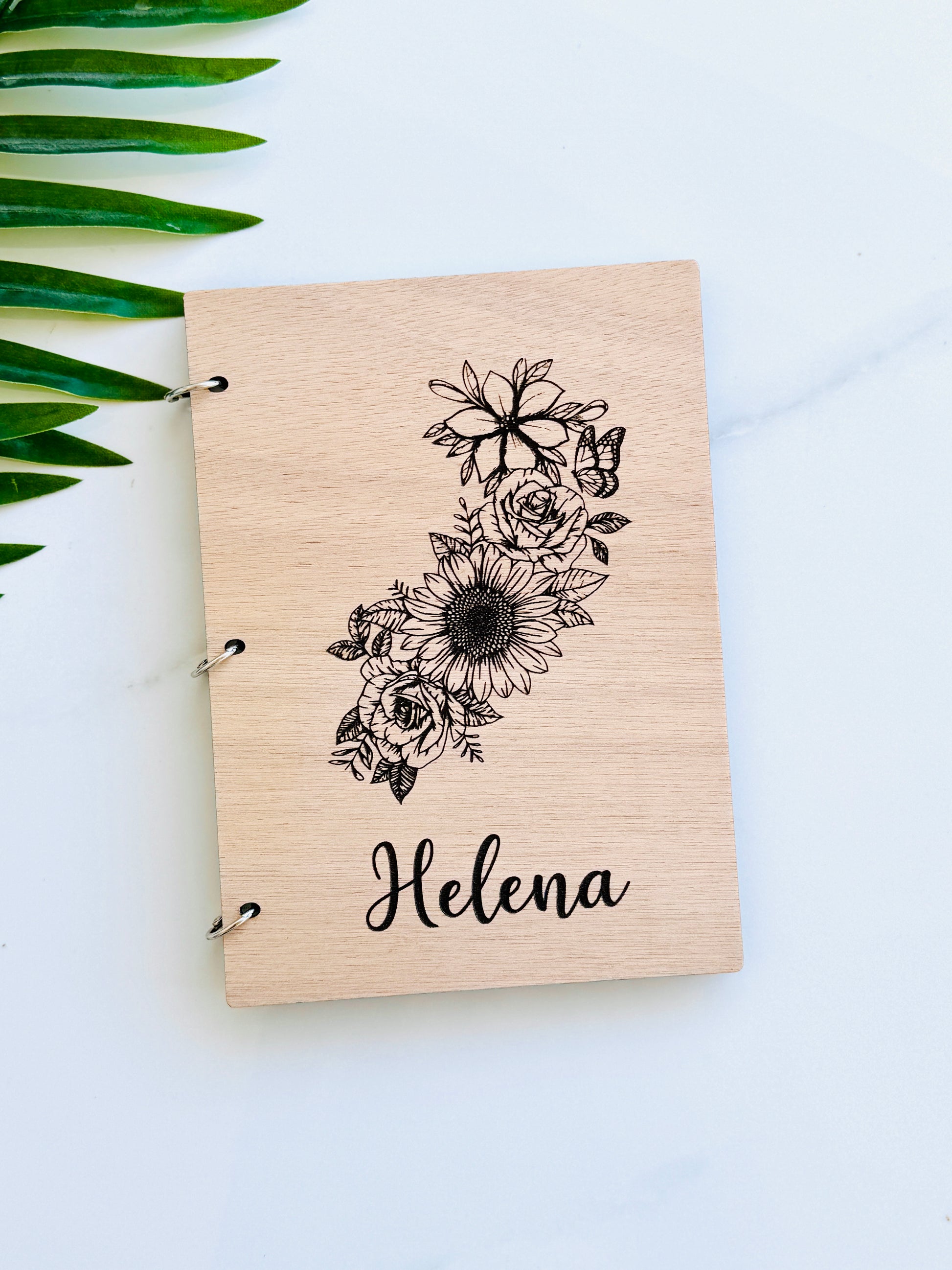 Discover the personalized sunflower notebook with a wooden cover, a distinctive journal planner designed for anyone passionate about writing.